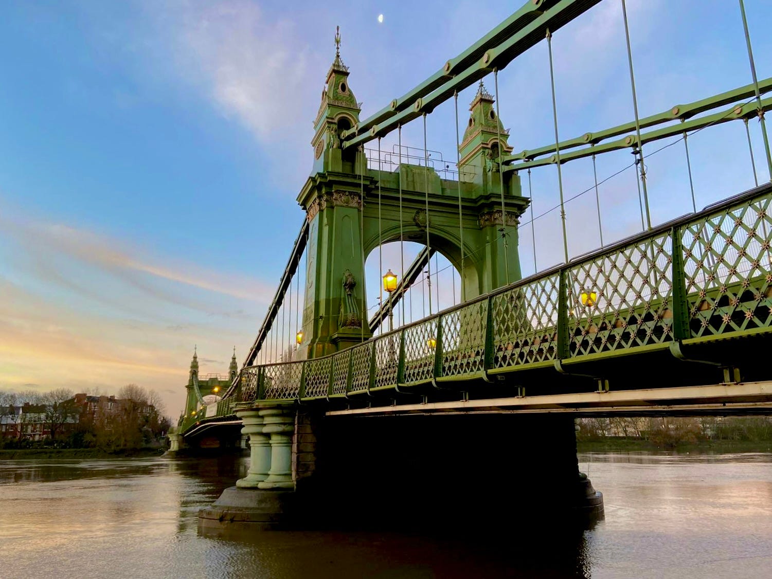 Hammersmith Bridge is a testament to Victorian engineering prowess. The present-day bridge is Bazalgette’s 1887 design: a wrought-iron suspension structure with ornate decorative features and coated in deep green paint that blends into the willow-lined bank.