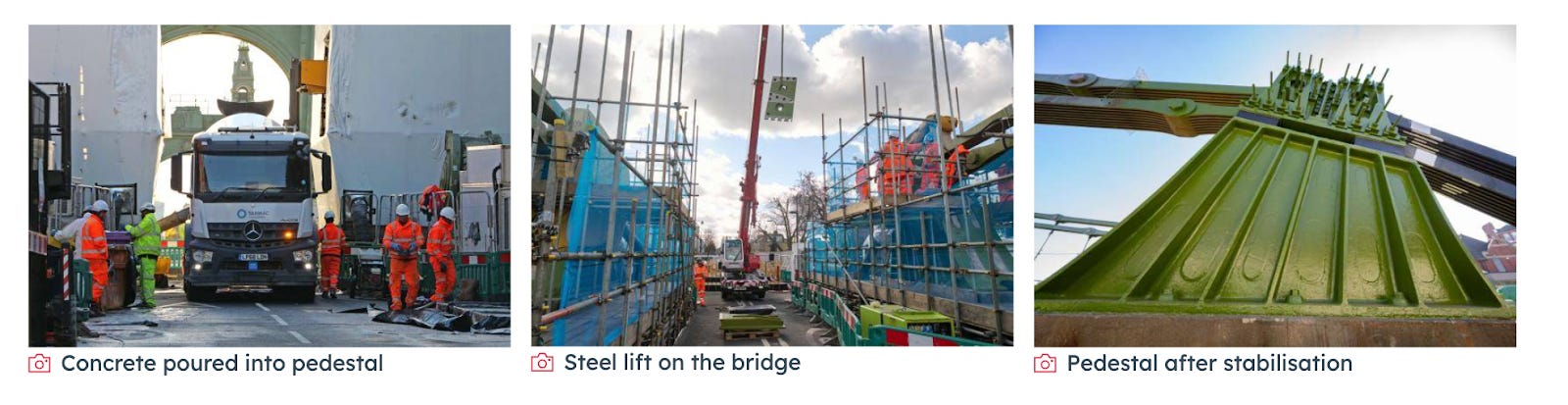 Stabilisation Works. Plans designed by Mott MacDonald. The casings of the four corner cast-iron pedestals were then removed and the pedestals were filled with fibre-reinforced concrete. This work was undertaken by contractor FM Conway and their sub-contractors, Freyssinet Ltd and Taziker Industrial Ltd.