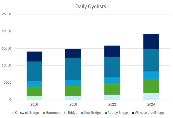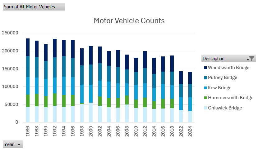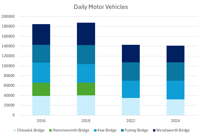 Back-of-the-envelope toll bridge calculation: LBHF estimates £7.5m annual finance costs for its £83m share (one-third of £250m total). If tolls cover all costs, that’s £22.5m yearly. Adding £1.3m maintenance and 15% collection costs requires £27m annually. Pre-closure, 18,000 private cars crossed daily. LBHF plans resident exemptions and expects lower usage. The M6 toll comparison is instructive: despite saving 40 minutes at £10.50 daily, only 15% of M6 traffic uses it. Applying this to Hammersmith Bridge yields just over £10m annually before resident exemptions, less than half the required amount.