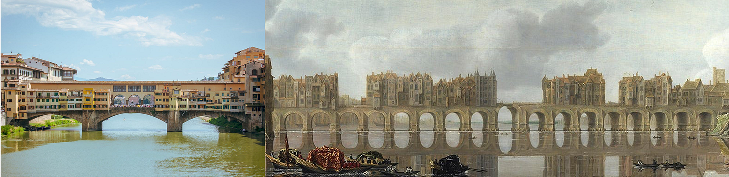 Inhabited Bridges. Lest we forget, London Bridge was once an inhabited street boasting shops and homes. Compare Florence’s Ponte Vecchio. A recent proposal for Hammersmith Flyover suggested that the council would fund a tunnel replacement by selling or leasing the land released on the ground. At at time when London is the epicentre of Britain’s housing crisis, there is surely a strong case that, if we were to re-build Hammersmith bridge we should build it to sustain buildings. The leasing or sale of the land for commercial or residential uses would fund some of the cost. One can imagine a vibrant high street springing up at this location, a tourist destination right next to major London transport centre, Hammersmith station.