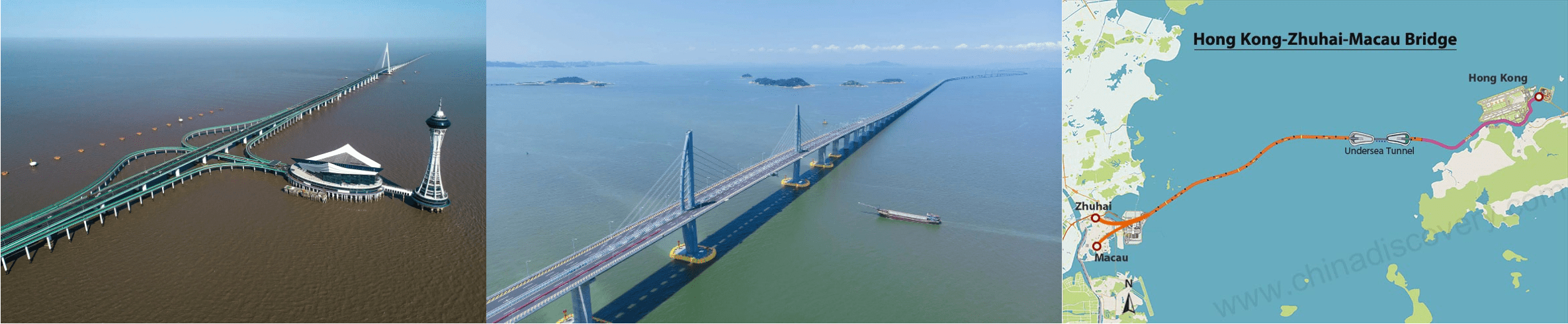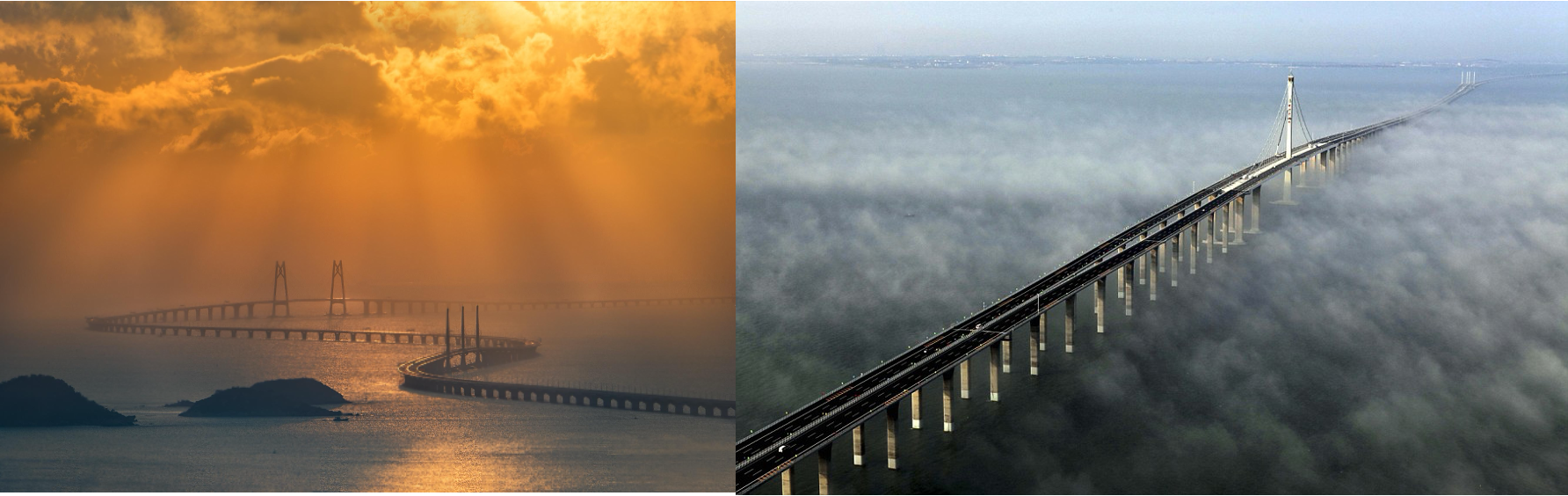 Additional visual aids. Left: Hangzhou Bay Bridge. Centre: Hong Kong-Zhuhai-Macau Bridge. Right: HKZM Bridge Map.