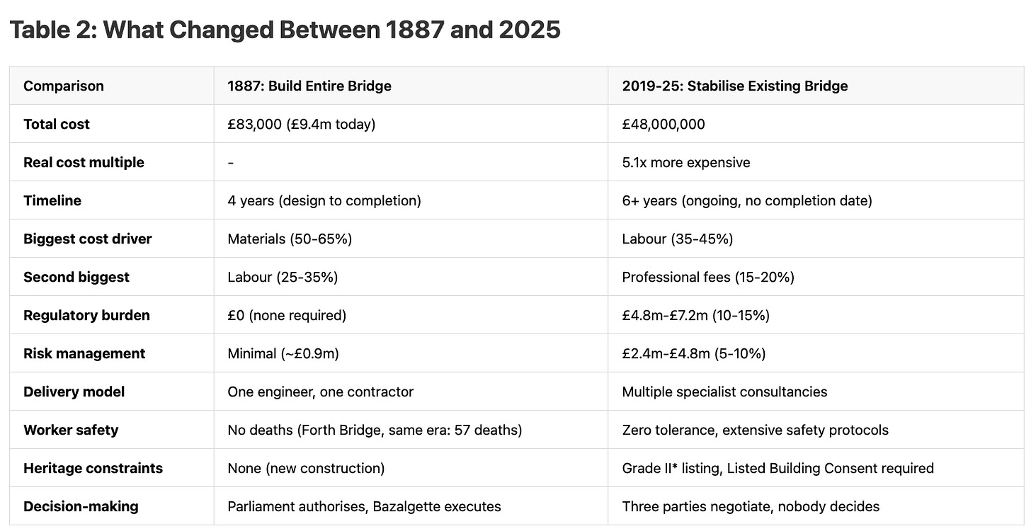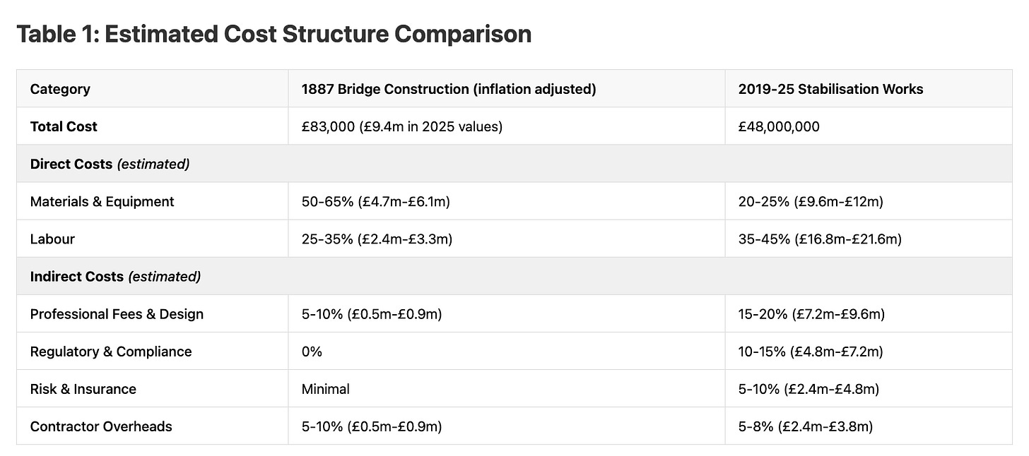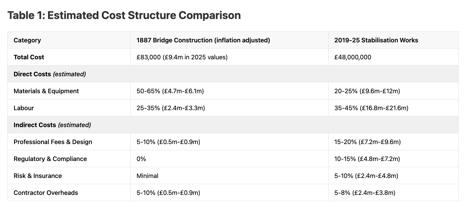 The 1887 bridge (£83,000, or £9.4m today) was dominated by material costs (perhaps 60%), with minimal professional fees and zero regulatory costs.15