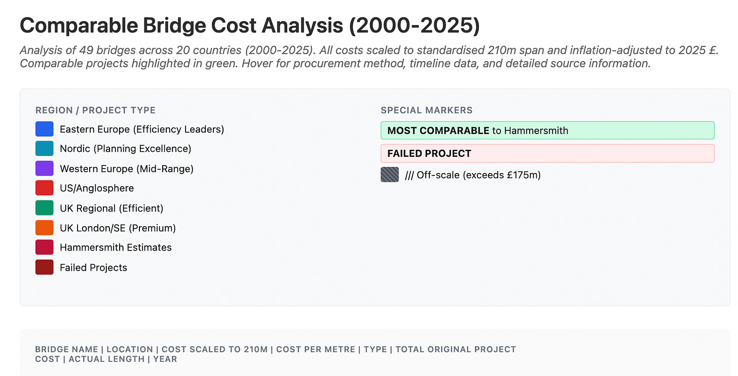 Comparable Bridge Cost Analysis: I compiled 49 bridges across 20 countries, calculated cost per metre, and scaled to Hammersmith Bridge. Sample criteria: