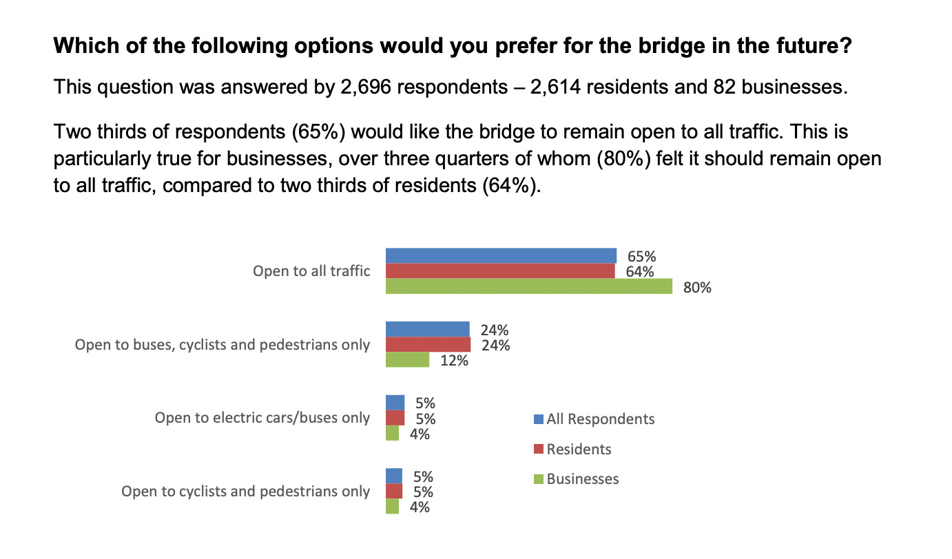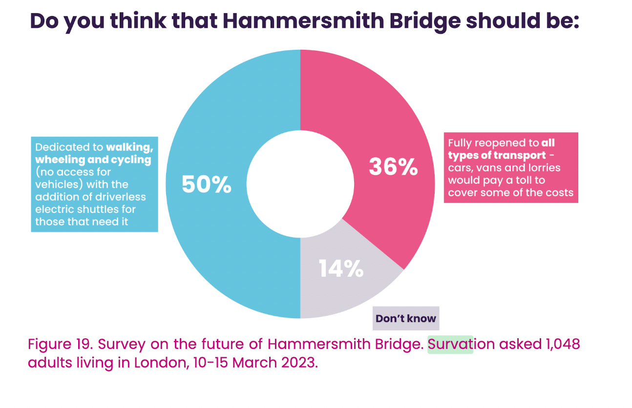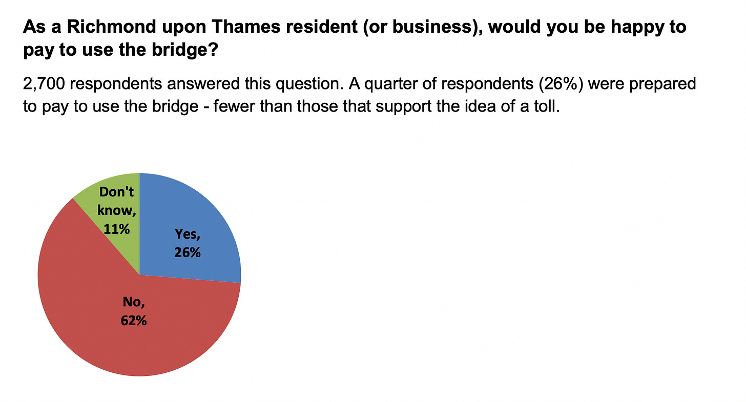 Tolling would therefore require subsidy.“H&F has made it clear it can only fund its share of the capital costs and ongoing maintenance through a toll or road user charge. A toll or road user charge would ensure that those who benefit from directly using the bridge, i.e. motorists, pay for its repair and continued operation.” Source: LBHF. Compare also this survey from Richmond Council, Source: Hammersmith Bridge Survey