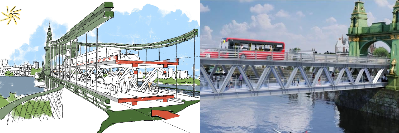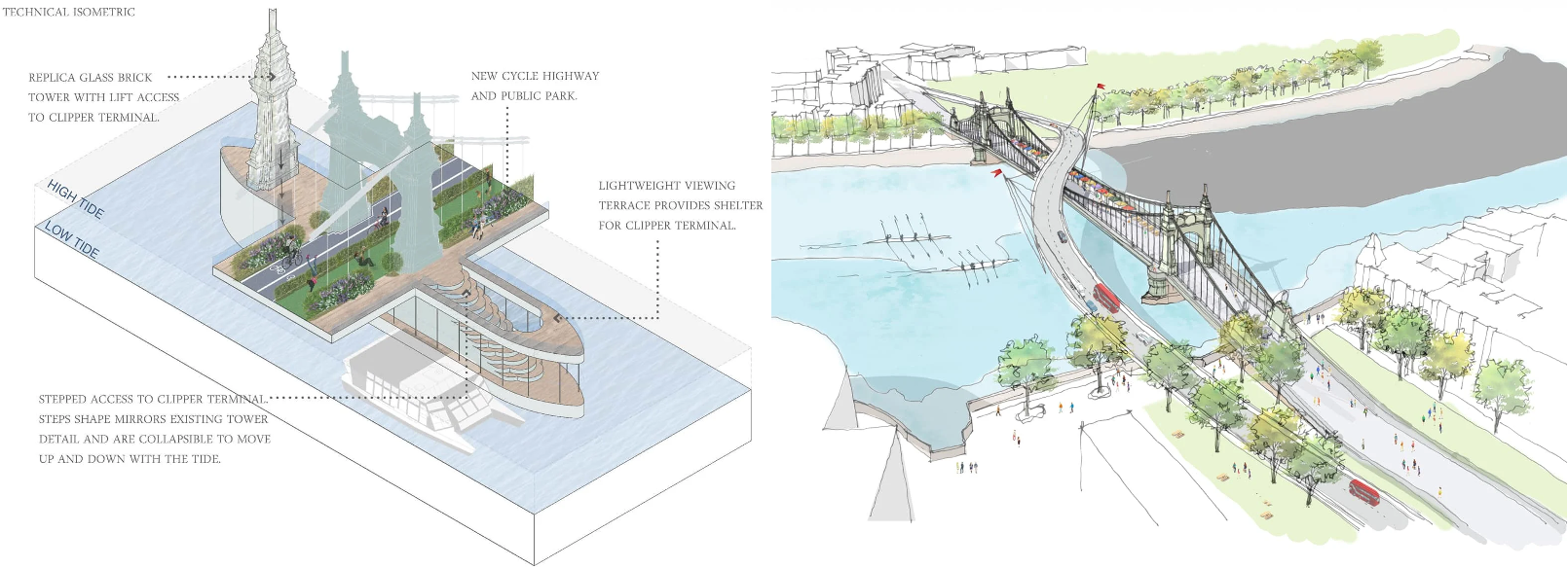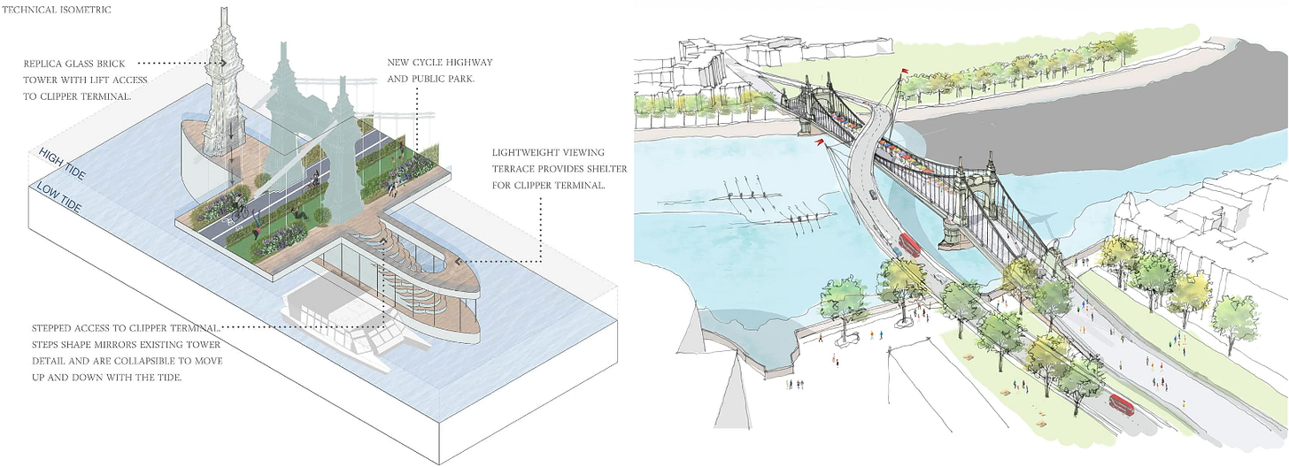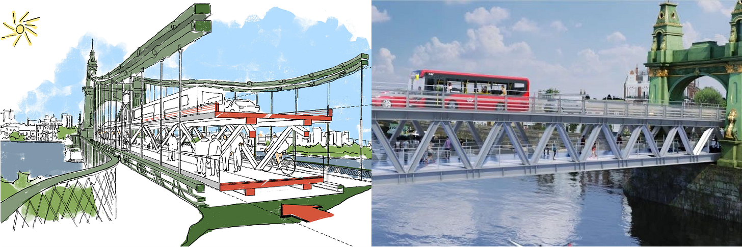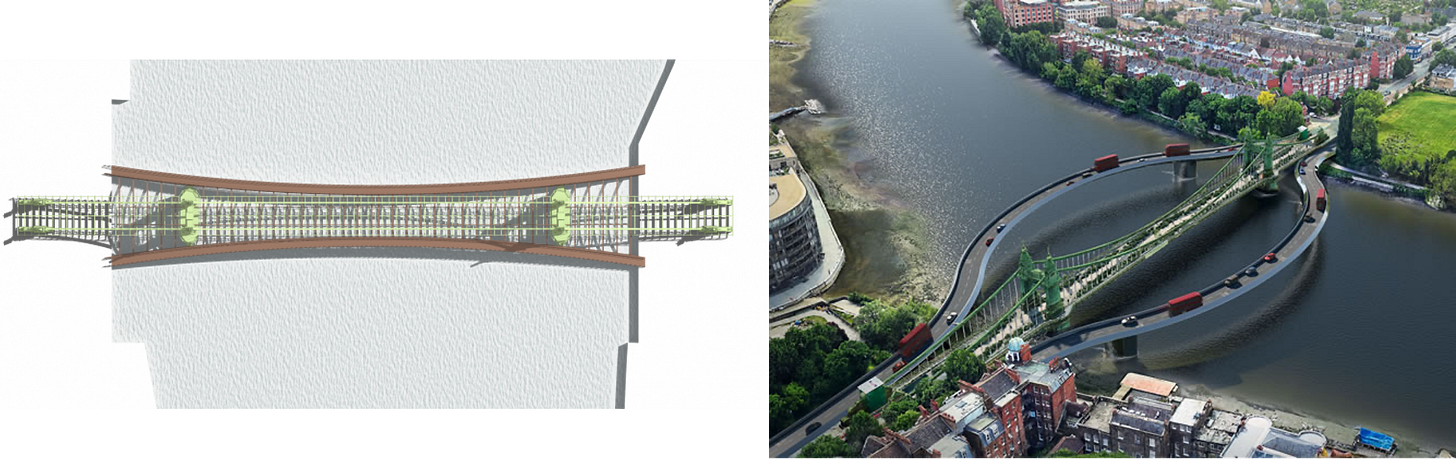 Baynes & Mitchell proposed a £110m interwoven structure. Sybarite’s inventive mirror-polished steel “ribbon” was dismissed as “another eccentric press stunt” by the council. Anthony Carlile Architects mocked up a temporary barge bridge. The Manser Practice held an internal competition yielding conceptual designs. The Richmond MP proposed licensed rickshaws.18 LBHF council have “not ruled out” funding restoration via a resident-exempt vehicle toll (though this appears unviable on basic calculations),19 whilst the DfT briefly considered permanent closure as a monument.