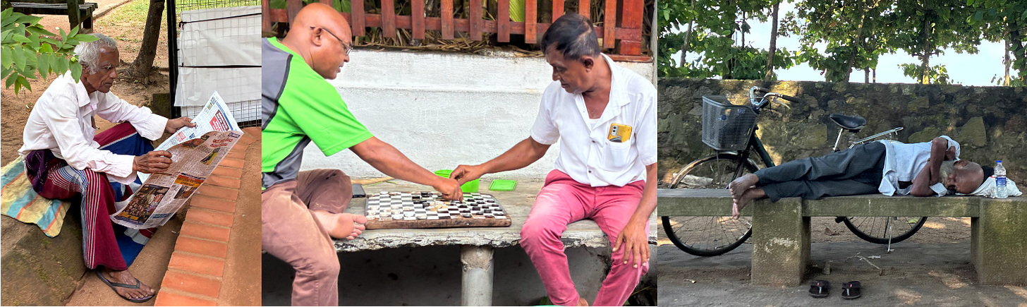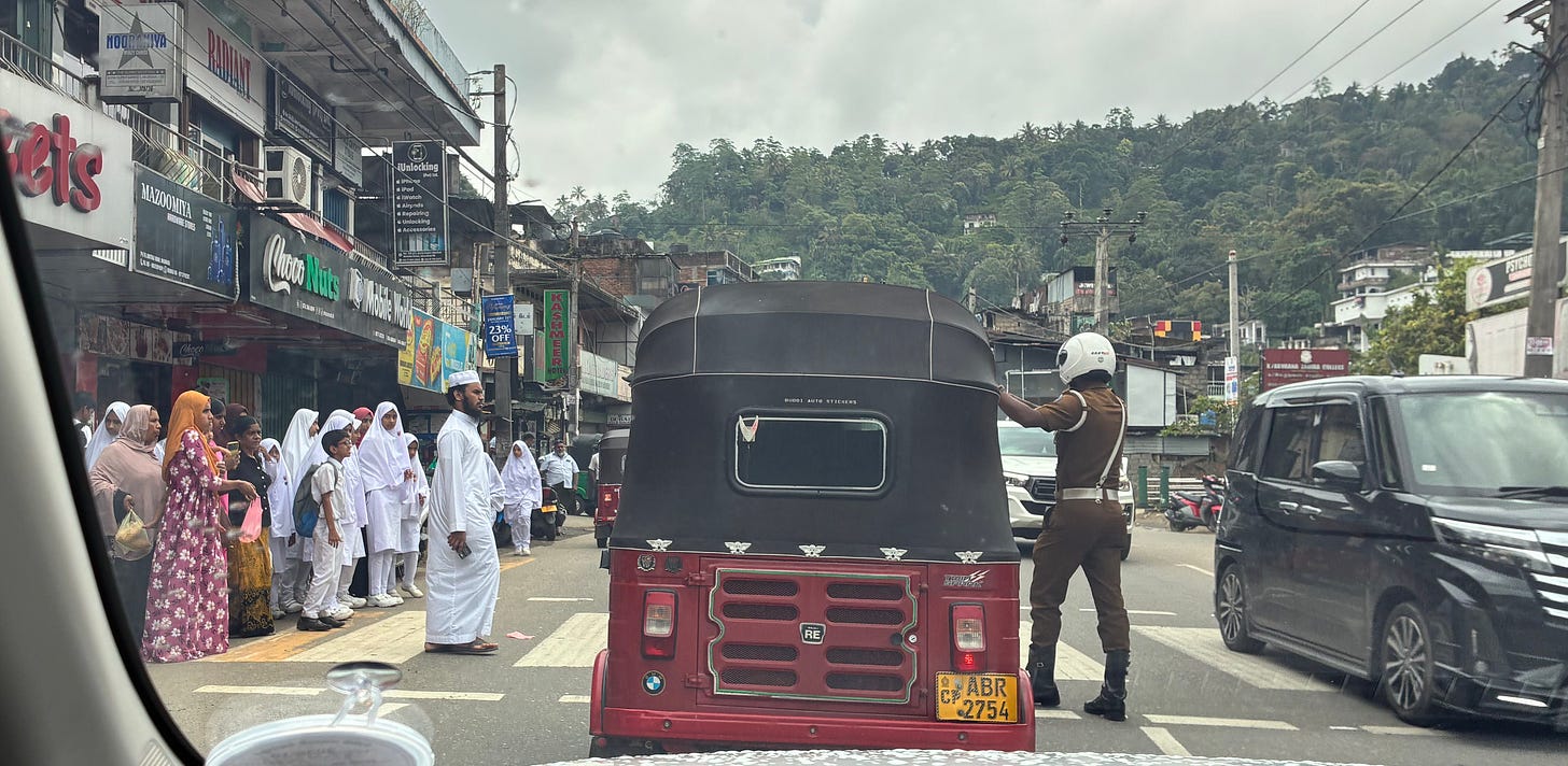 On clothing: all schoolchildren wear white, intended to erase visible class and caste difference. You see them commuting home at midday. In Kandy, Muslim girls in white burqas walked alongside boys carrying cricket bats. Older men wear sarongs; younger men wear trousers. The transition appears to happen around fifty, overnight.