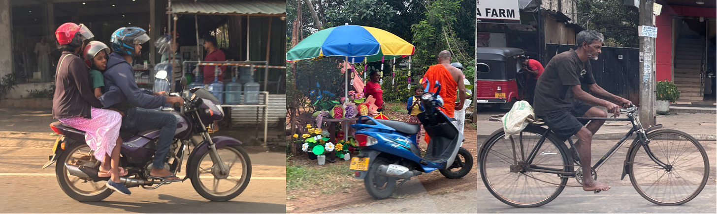In terms of vehicles, on any given stretch of road there are tuk-tuks, motorbikes carrying entire families, bicycles, vans crammed with standing passengers, buses, new SUVs, ancient trucks, the occasional bullock cart. Add to these dogs sleeping in the road, monkeys darting across, cats watching from the verge, and occasionally a farmer who has expropriated half the carriageway to dry rice in the sun. Everyone coexists in a state of negotiated chaos that seems terrifying for the first hour and then becomes the inevitable reality of the road, and you stop noticing it the way you stop noticing weather, until an almighty rainstorm, or bus, ploughs towards you.