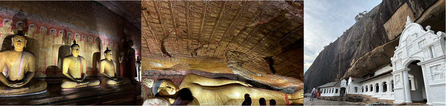 Sigiriya is particularly remarkable: a 5th-century fortress on top of a vast rock outcrop, with frescoes, water gardens, and a lion-paw gateway carved into the cliff face. Fifth-century monks climbed the dizzying height daily, reportedly without incident. By contrast, amongst the elderly European tourists ahead of me, I counted two panic attacks and a possible cardiac arrest.