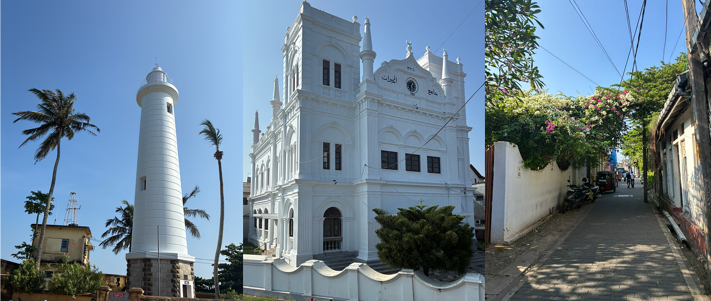 The Fort at Galle is a microcosm of the island’s layered colonial history: Portuguese, Dutch, British, and now a place where a Chinese restaurant advertises in English, Chinese, and Russian. Further along the coast, Hambantota Port was built more recently with Chinese money the government failed to repay; it is now “leased” to China for 99 years.