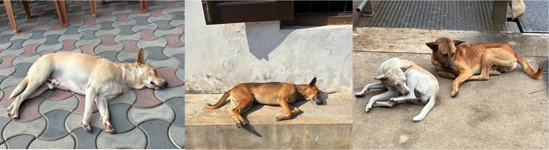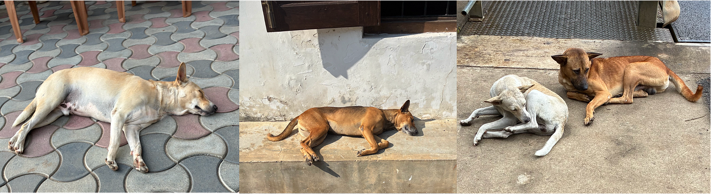 The stray dogs merit their own study: every dog appears to have devolved toward an Ur-dog or platonic canine form. Medium-sized, tan colour, short-haired, nondescript, sleeping in the middle of the road with the serene confidence that traffic will go around them. It does.